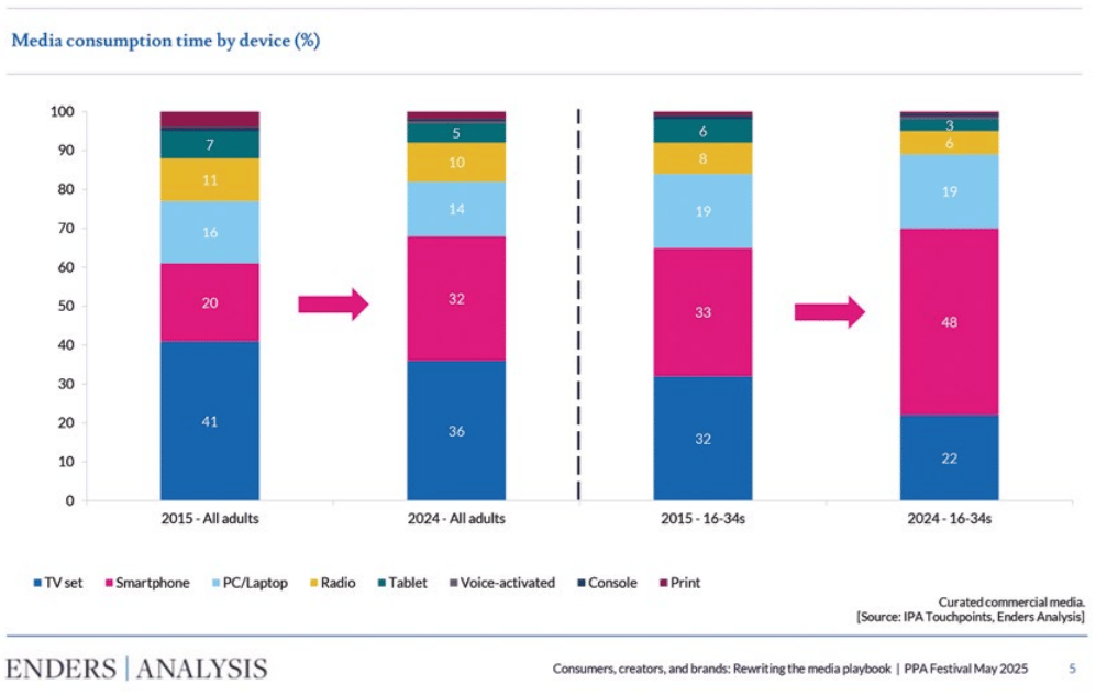 Time online tripled between 2010 and 2024, to reach 4 hours and 20 minutes a day. According to Enders’ Rewriting the Media Playbook, under 34s spend 48% of all of their media time on their smartphones. Even when they are spending time with TV, almost 70% of consumers under 34 look at their phones fairly or very often.